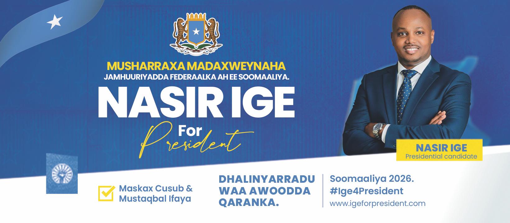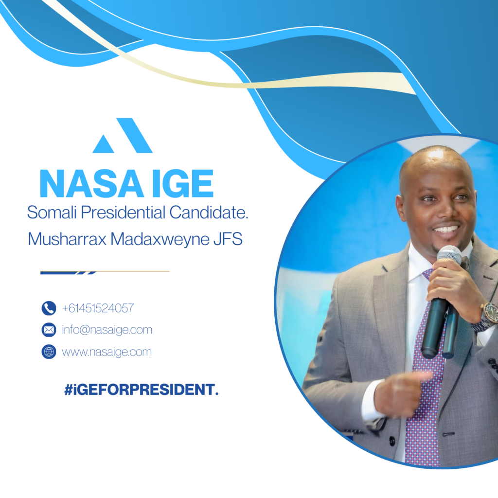 Nasa Ige is a presidential candidate for the Somalia 2026 election, running on a platform anchored in national security, stability, and inclusive leadership. His foremost priority is strengthening security and eliminating terrorist groups, with a clear commitment to restoring public safety and protecting Somalia’s sovereignty.